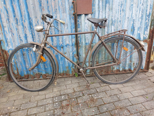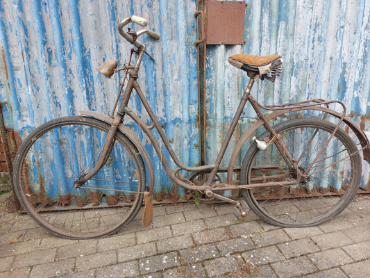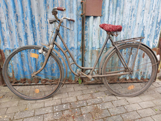 Eine Pedale fehlt. Der Ledersattel ist vermutlich nicht original, weil etwas zu groß. Schutzblech hinten ist auch nicht mehr dran. Wir können zu dem Fahrrad leider nicht viel sagen. Wir haben es gekauft, weil es dekoartiv ist und habe es nur Dekoration genutzt.